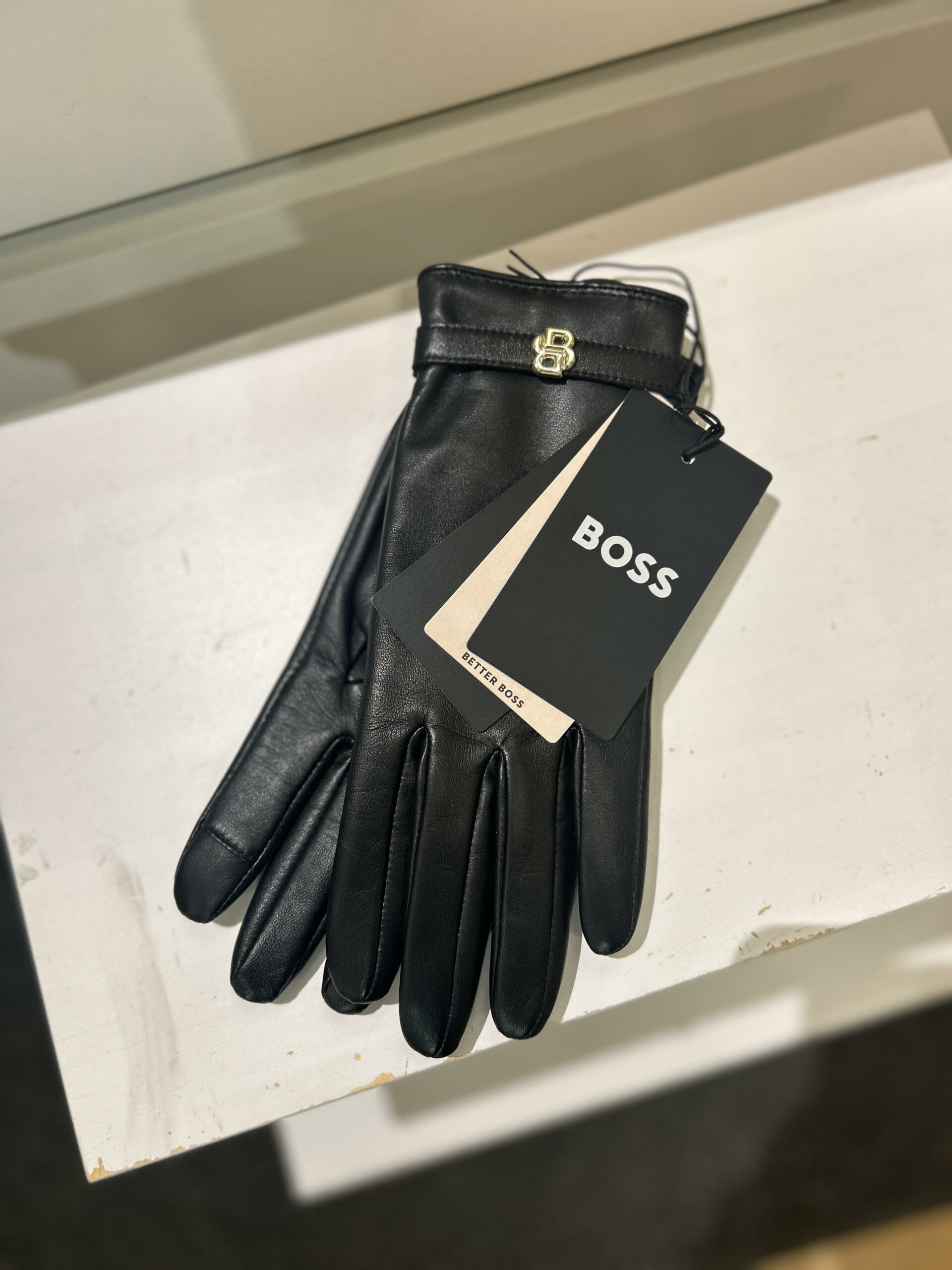 Handsken är utrustad med touchfunktion på tumme och pekfinger, vilket gör det enkelt att använda mobil eller surfplatta utan att ta av dem. En diskret BOSS-logga i guld pryder handleden och ger en elegant finish.