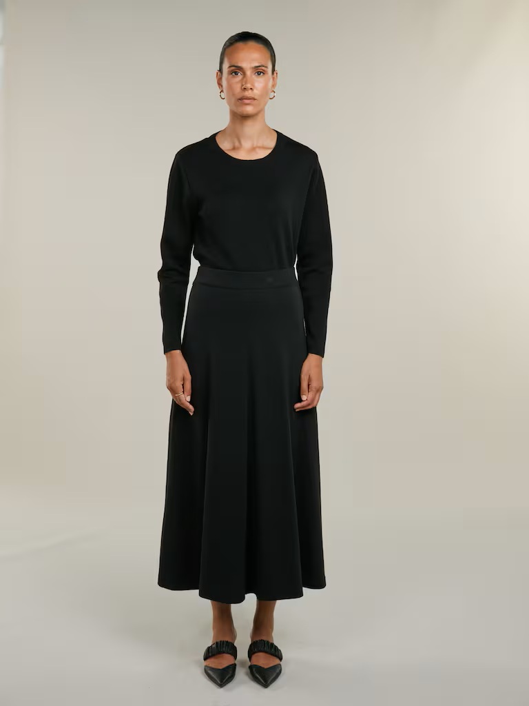 Denna långa och vida kjol är tillverkad av merinoull och har en elastisk midja.